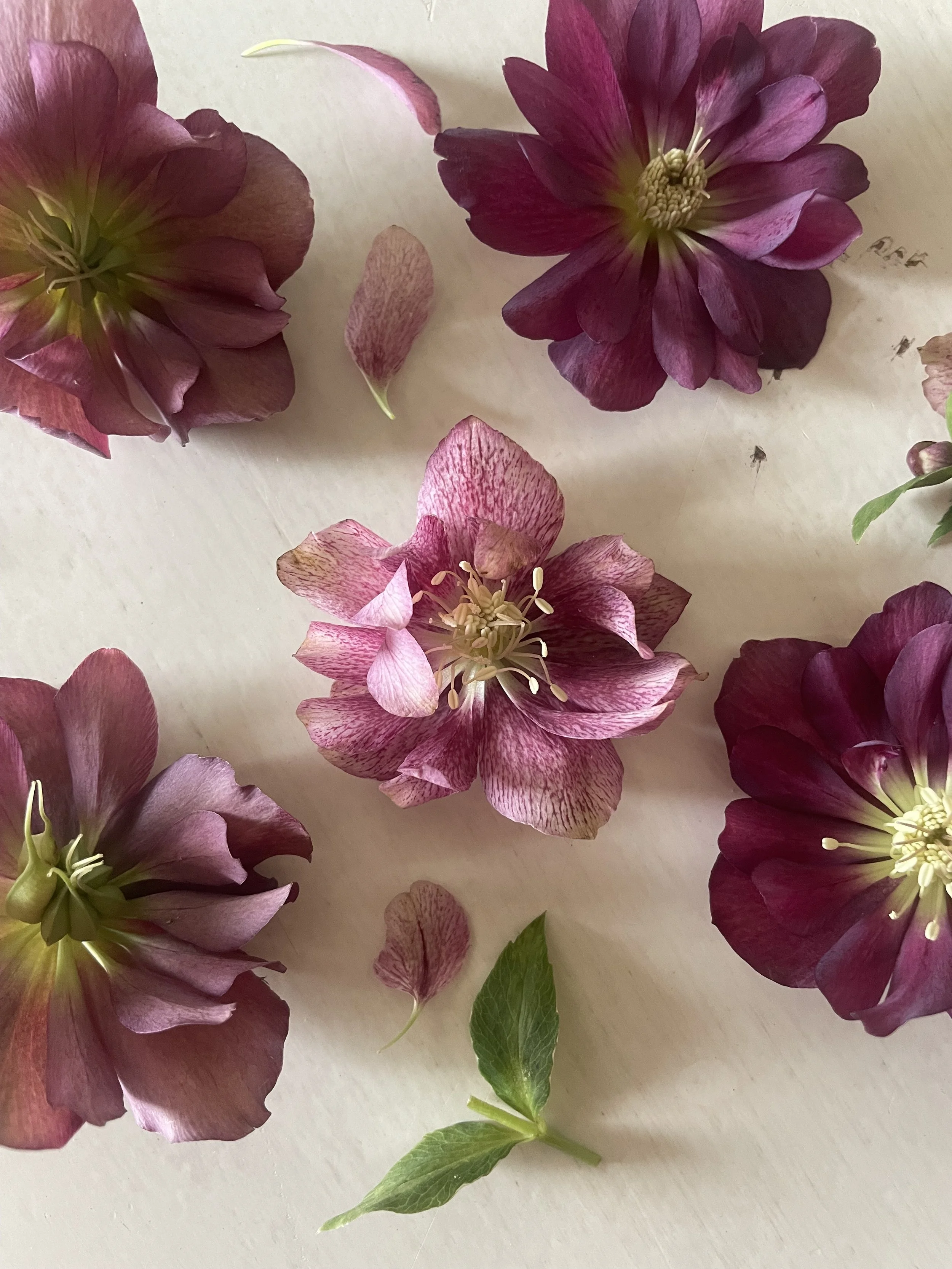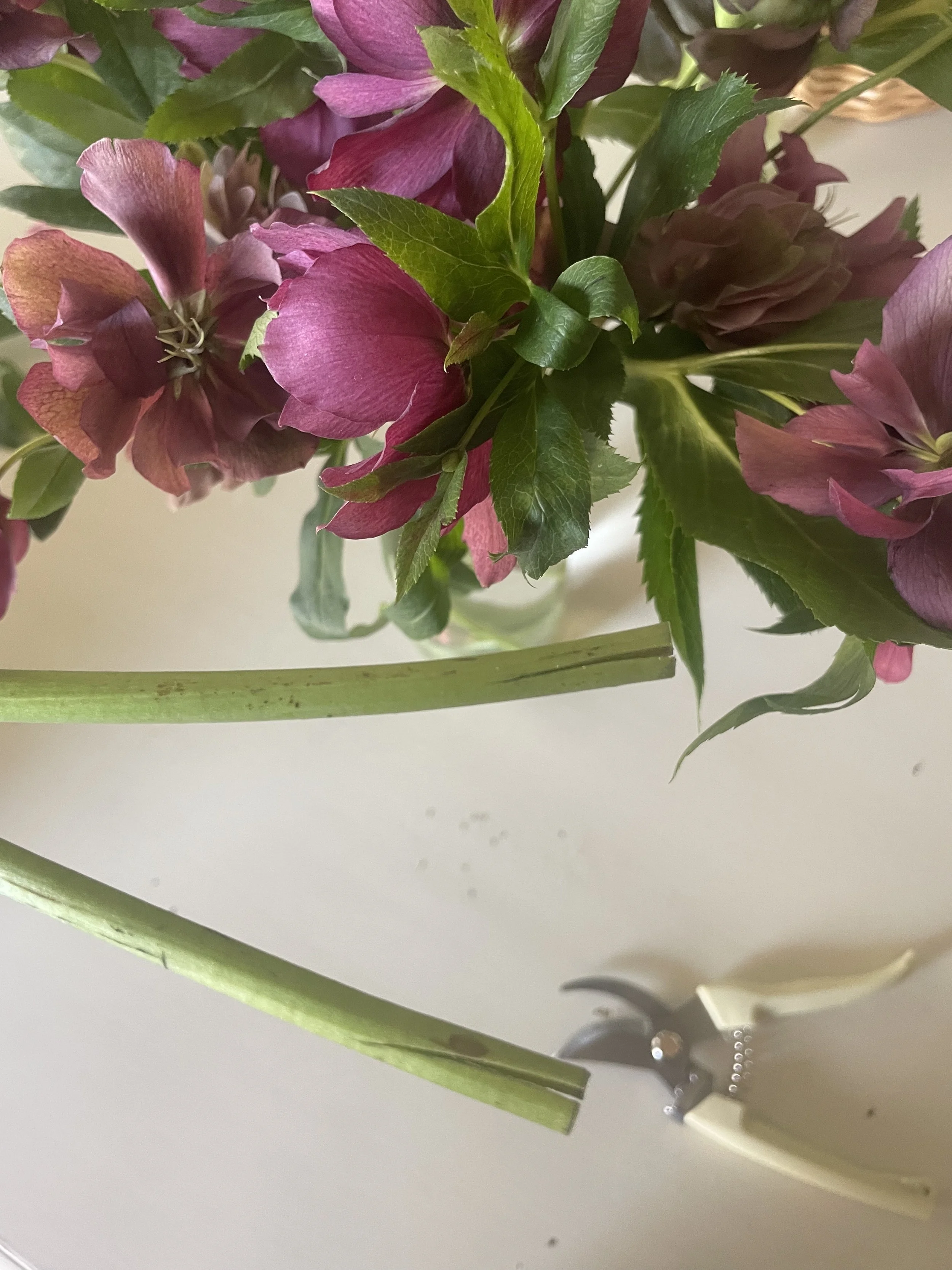 Designer’s Tip: Instead of snipping the ends of your stem vertical, snip in half. Hellebores are thirsty and love the extra hydration.